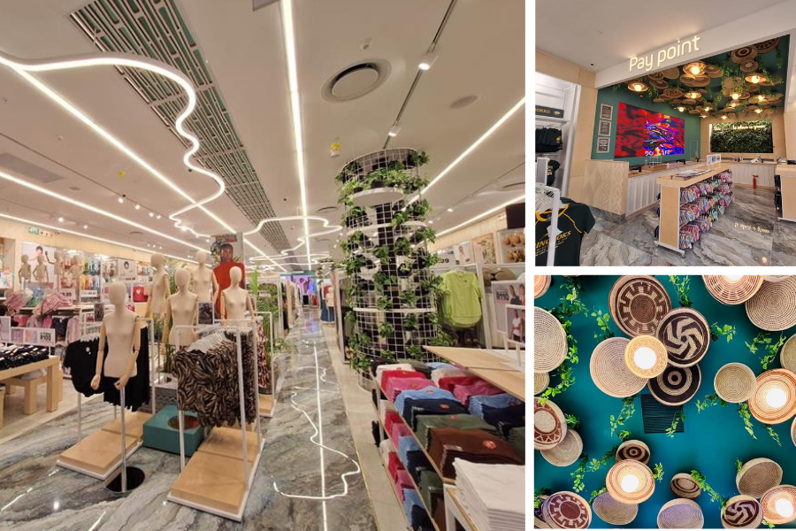 The design features unique elements such as sugar cane panels on the ceiling and light fixtures to mimic the Tugela River. Additionally, customers will notice local tribal prints on various fixtures, highlighting the rich local culture. The fitting rooms, designed to resemble shipping containers, pay tribute to the Port of Durban. They showcase historical details celebrating landmarks such as the Comrades Marathon, the Red Desert, and Raymond Ackerman, the founder of Pick n Pay.