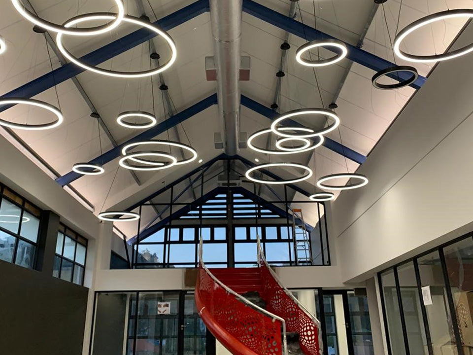 Polaris: Suspended from the ceiling in the open-plan office area at various levels are circular lights of different sizes. These lights mimic the patterns on the carpets and the architects regard them as the champagne bubbles, or ‘celebration’ of the building. The 25 fixtures were once again made from aluminium profiles of 600mm, 1 metre and 1,5 metres in diameter, with LED lights embedded in them. Rubicon Lighting had to manipulate the lumen output of each Polaris to ensure that the light intensity coming from each fixture was consistent with the next one.