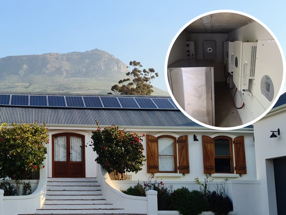 This Stellenbosch estate is running on energy from the sun with a full backup solution we supplied. It consists of Deye inverters and a 40kW Blue Nova high current battery with Canadian Solar modules.